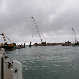 Création d'un môle d'escale avec caissons amortisseurs, au bout du quai A. En face continuation des travaux du musoir de protection.